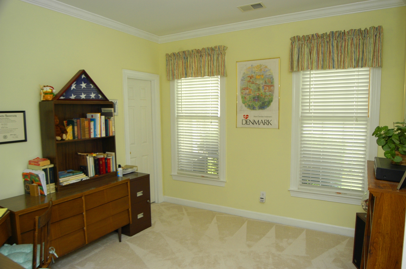BEDROOM TWO has neutral carpet, a walk-in closet, crown molding and 2 windows. Used as home office by present owners.