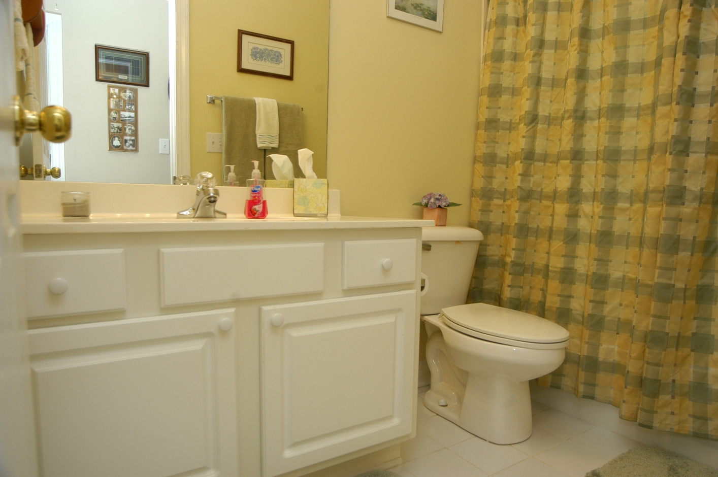 HALL BATH has a white vanity cabinet with cultured marble top and sink. Ceramic tile floor. Tub-shower combination.