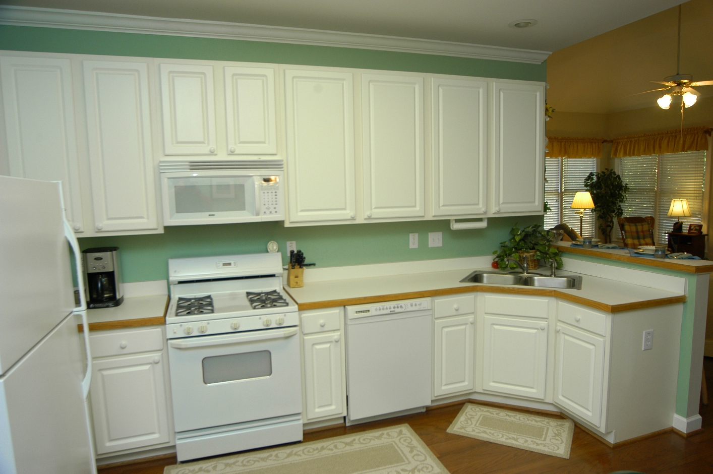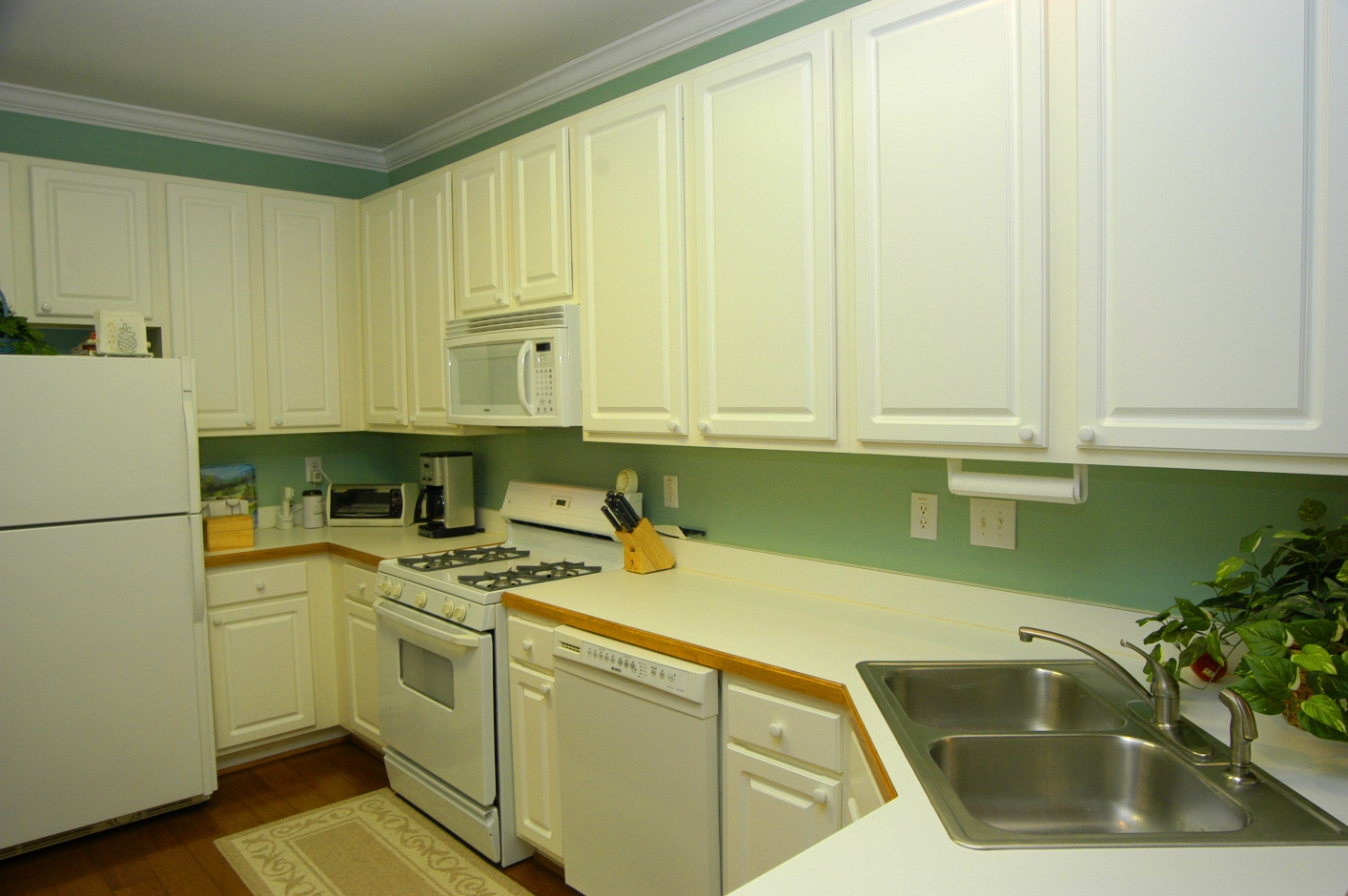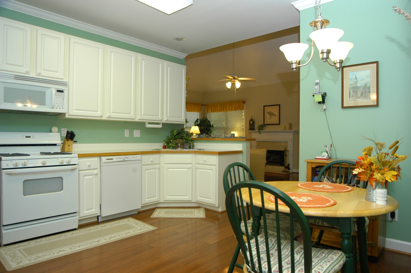 SPACIOUS KITCHEN has 5 inch plank hardwood floors, white raised panel door cabinets with white Formica top (oak nose trim). Double stainless steel sink. Recessed light plus fluorescent lighting. Breakfast bar. Two door pantry,