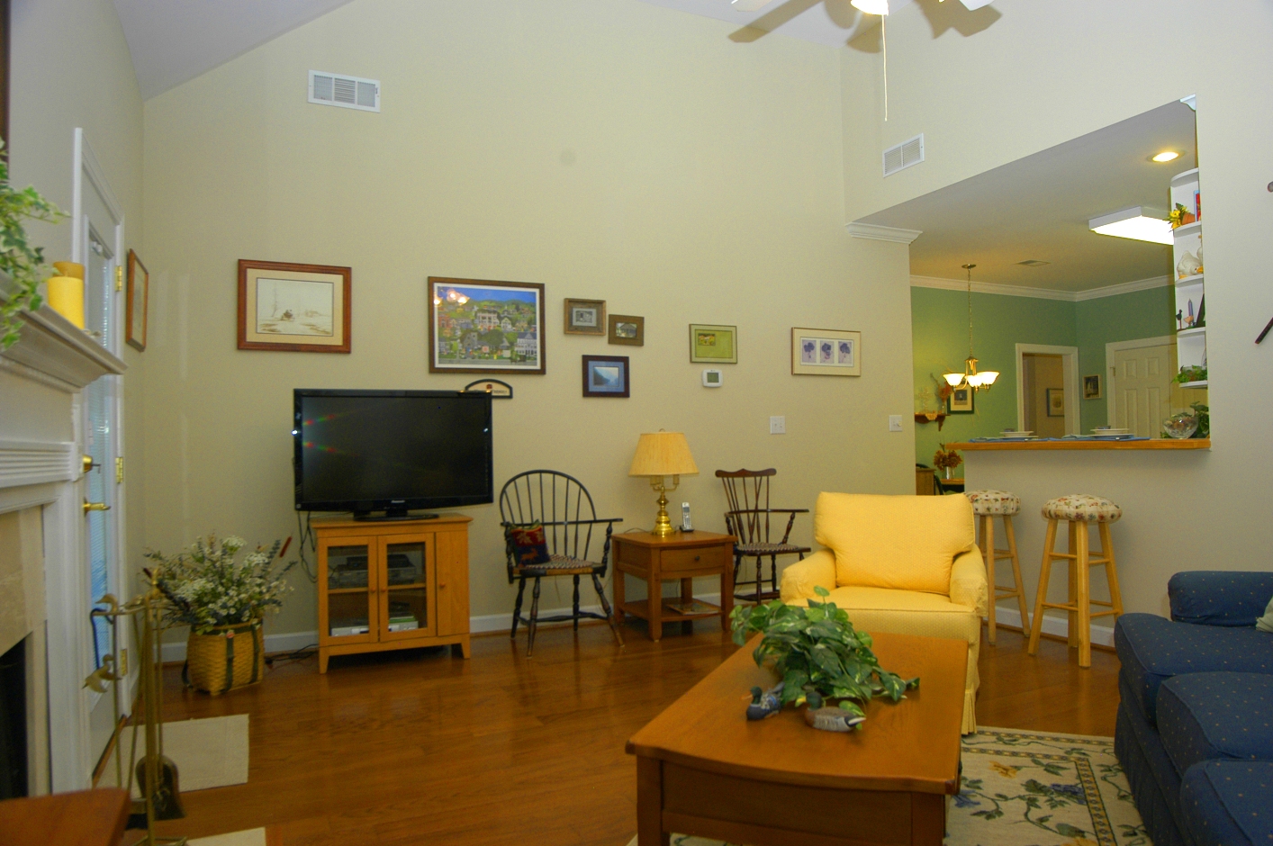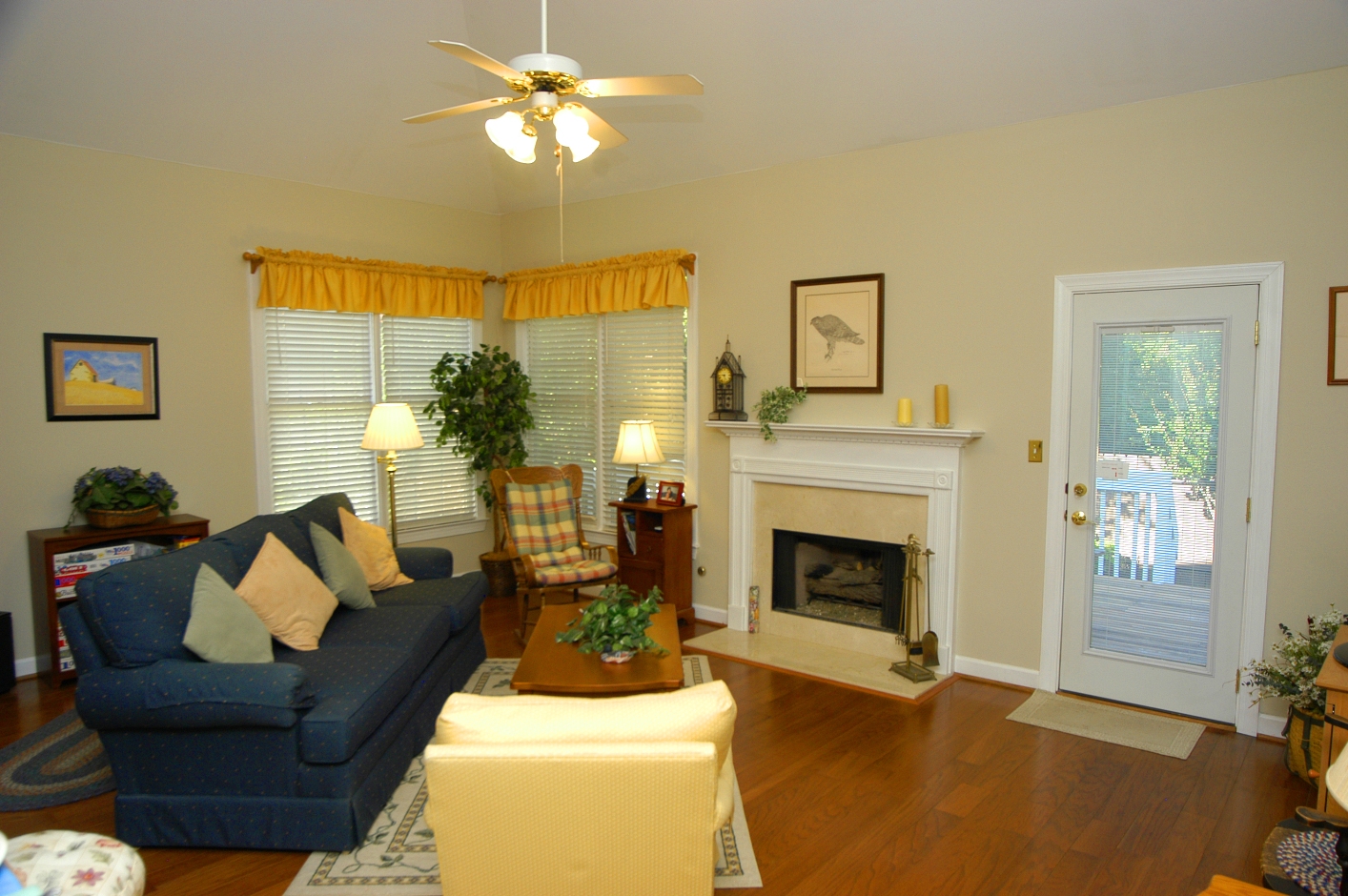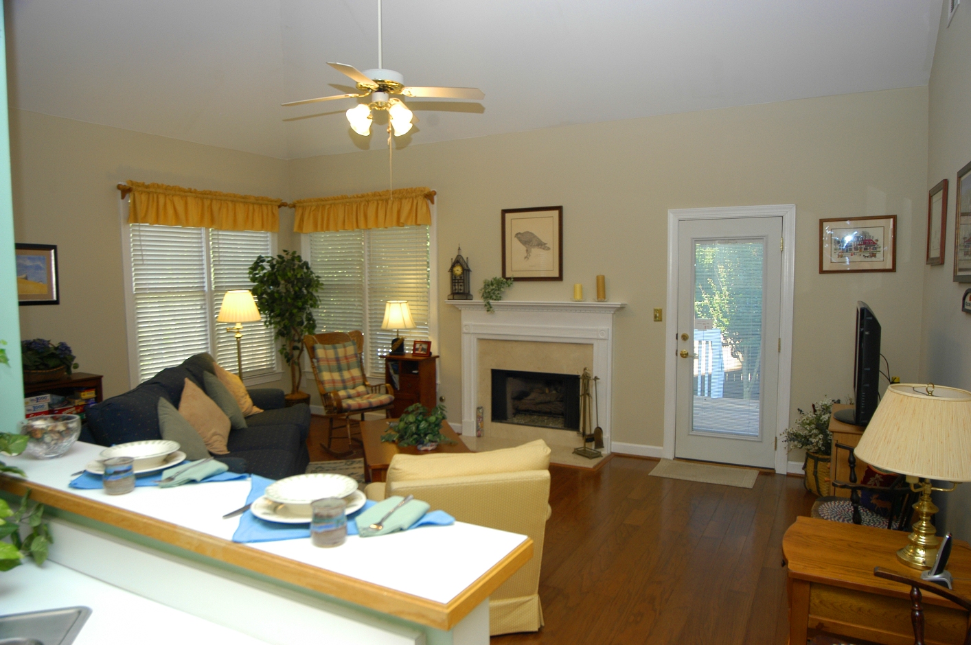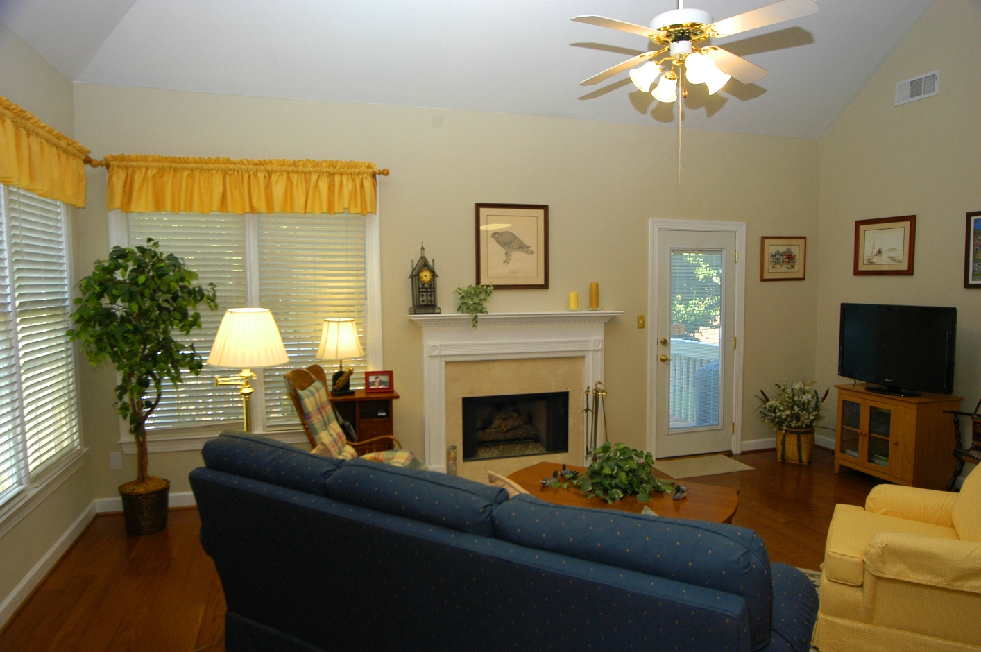 VAULTED FAMILY ROOM features hardwood floors, fireplace with brick logs, cultured marble surround and custom mantle. Door to deck 2 inch wood blinds on windows. Separated from kitchen by a breakfast bar. Ceiling fan and light.