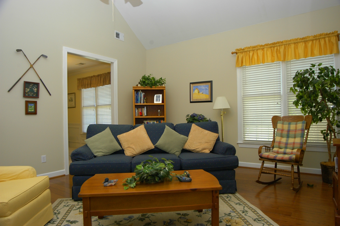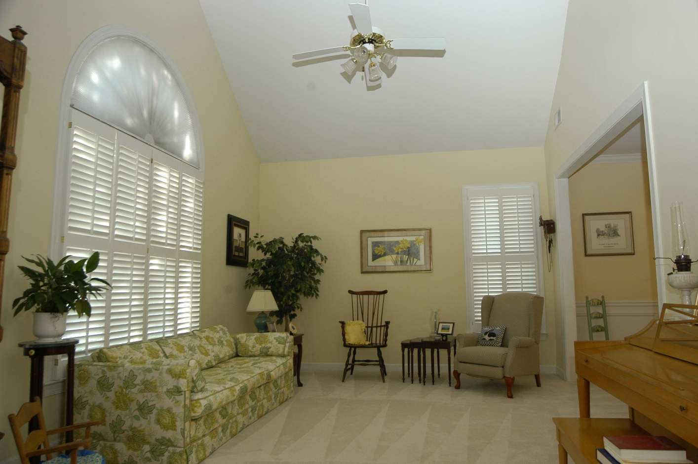 FORMAL LIVING ROOM has a deep vaulted ceiling, neutral carpet, double windows with large radius window above. Ceiling fan and light. Cased opening to dining room.