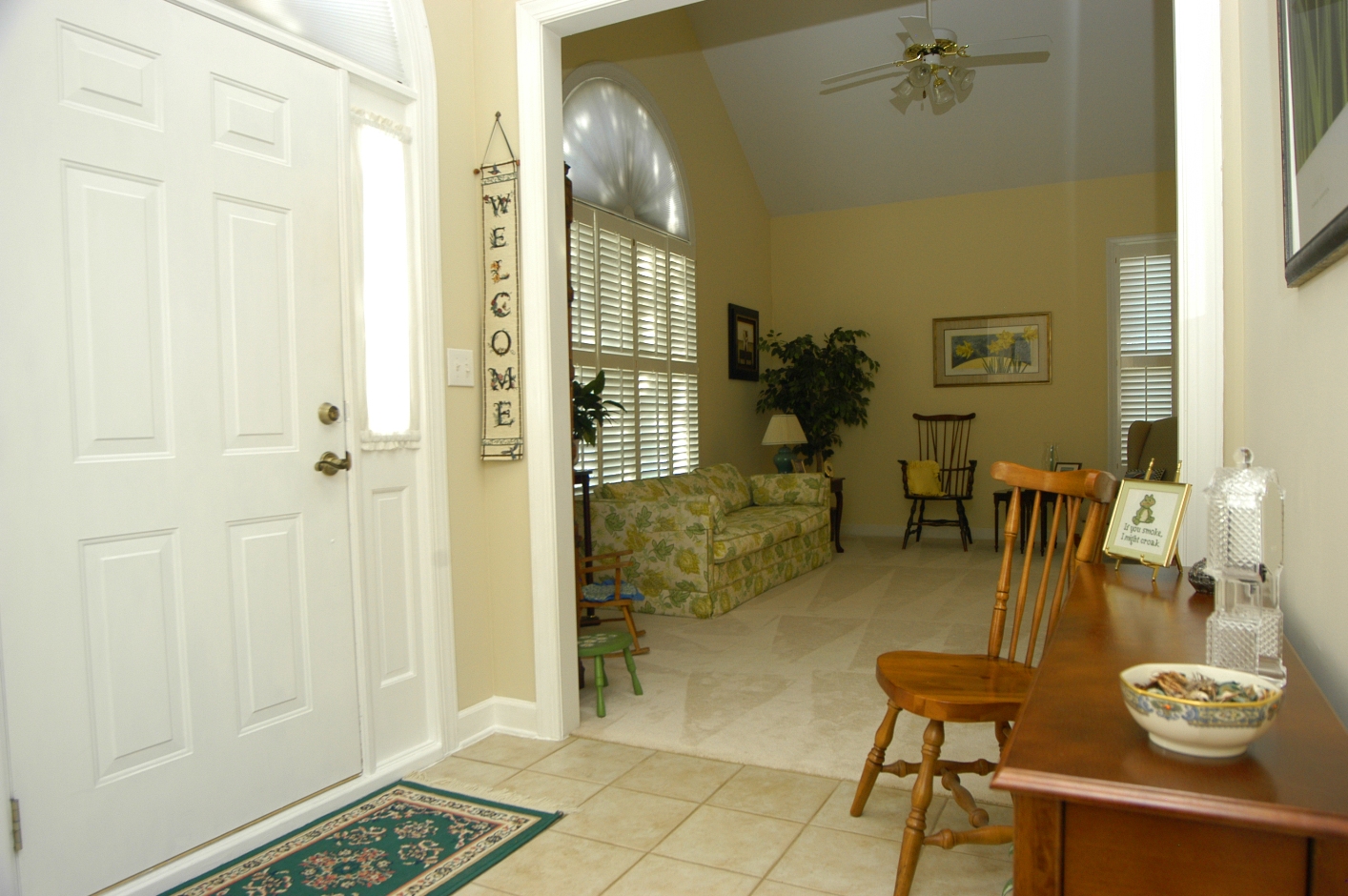 ENTRANCE FOYER features a vaulted ceiling, radius window above front door, ceramic tile floor, cased openings to living room and hall.