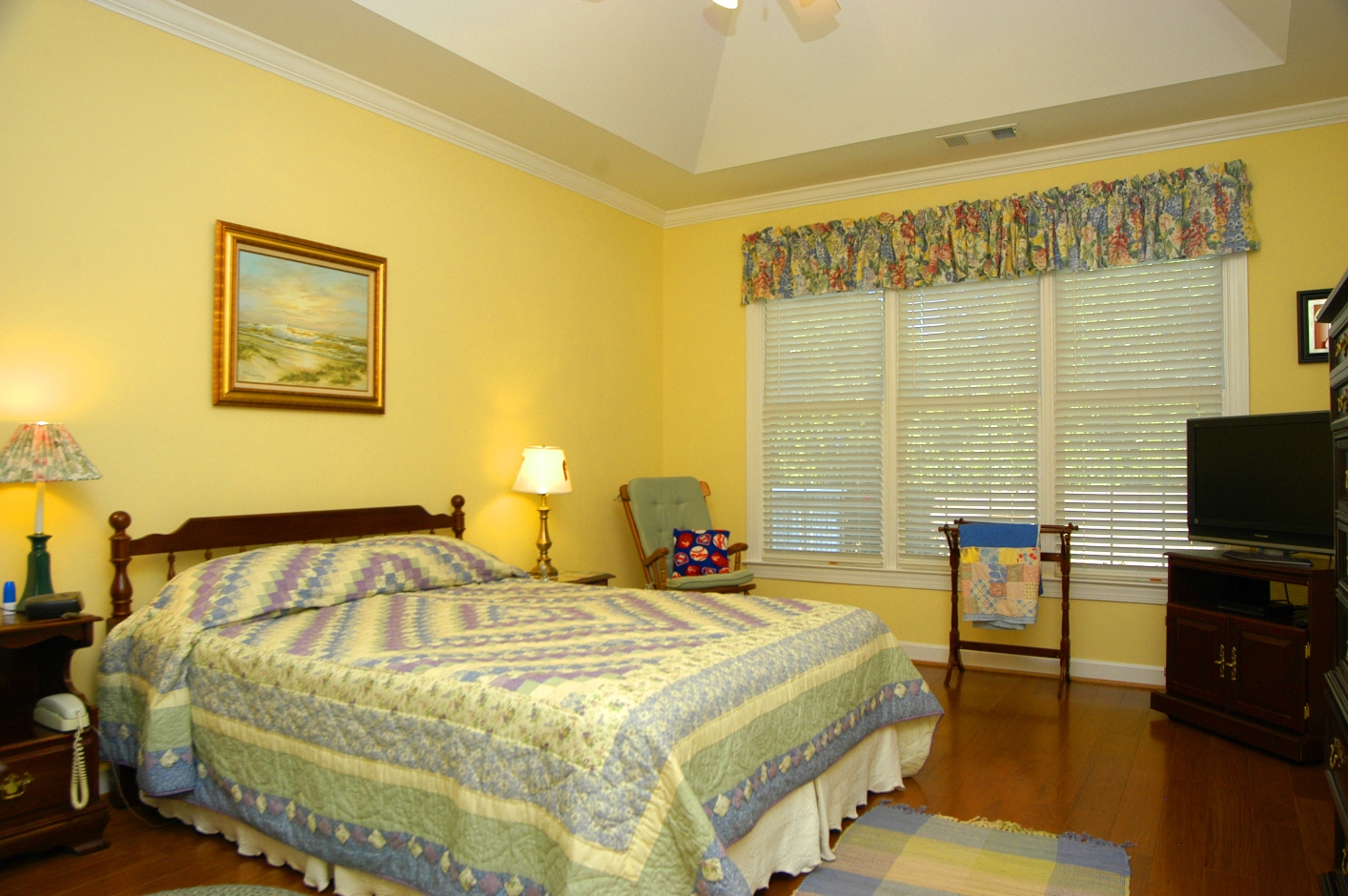 MASTER BEDROOM SUITE: spacious bedroom features hardwood floors, ceiling fan and light. Deep tray ceiling and 3 windows.