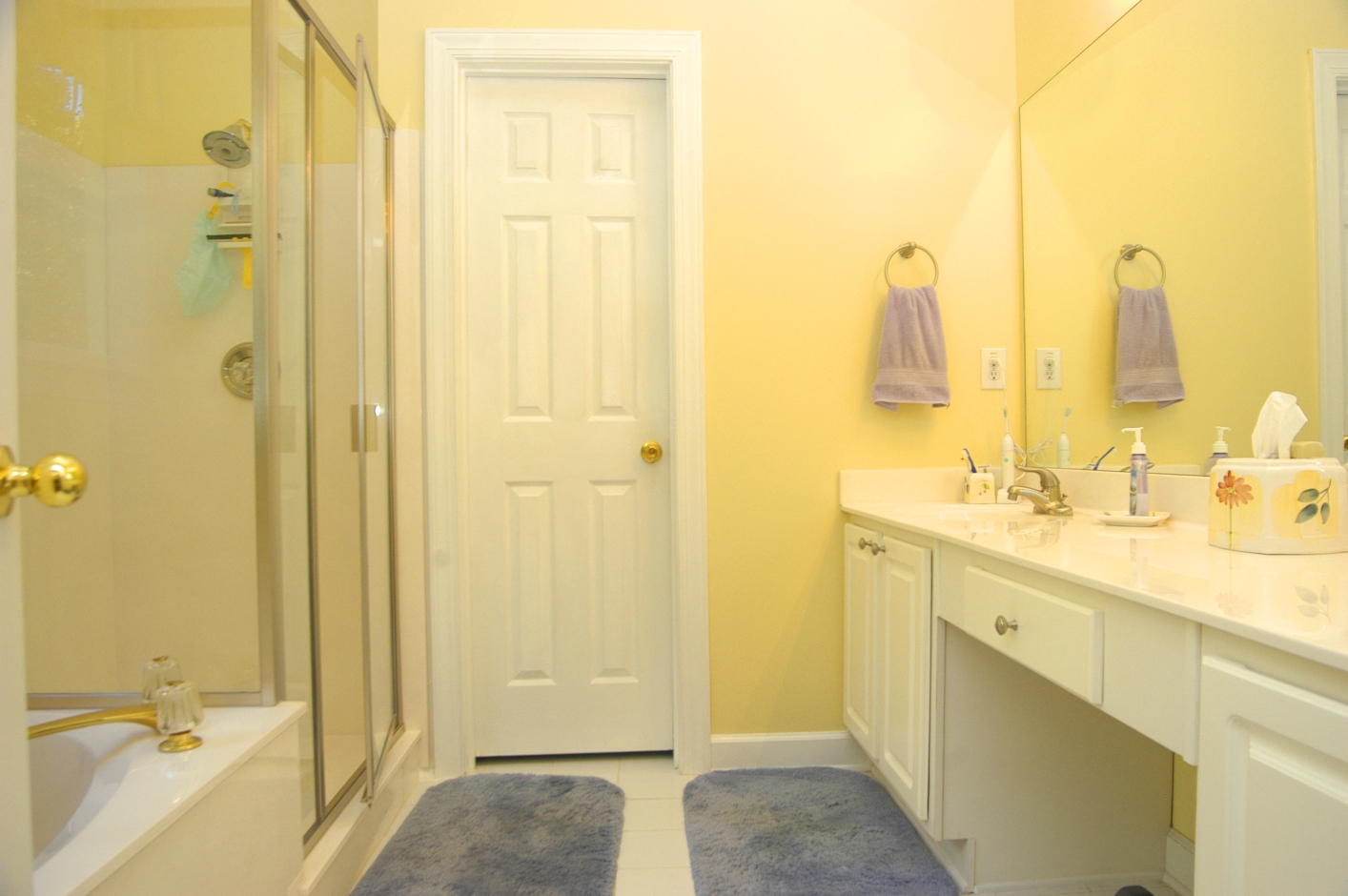 UPDATED MASTER BATHROOM has a jetted garden tub with picture window above and cultured marble surround. New faucet and controls. ALL NEW walk-in shower with clear glass wall and door (brushed nickel finish). Large white double vanity has a makeup desk, cultured marble countertop and two cultured marble vanity sinks. NEW brushed nickel vanity sink faucets. White ceramic tile floor. New vanity light fixture. Volume ceiling. Separate toilet area with ceramic tile floor and linen closet.