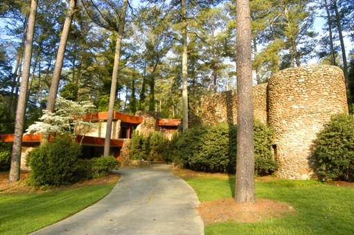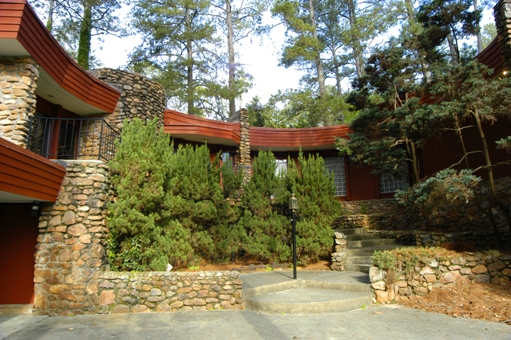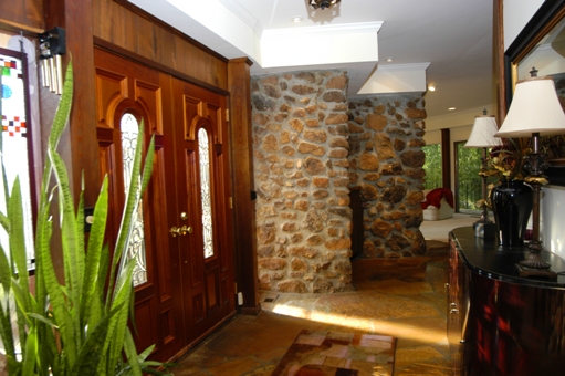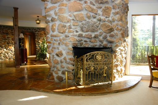 • Stone turrets, exposed stone walls, stone fireplaces throughout home.
