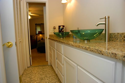 • JACK AND JILL BATH features a vanity area with double white vanity cabinet, clear glass vanity sinks, granite countertops, unique stainless faucets. Ceramic tile floor. 2 linen closets. WET AREA features a sunken tub/shower and a ceramic tile floor.