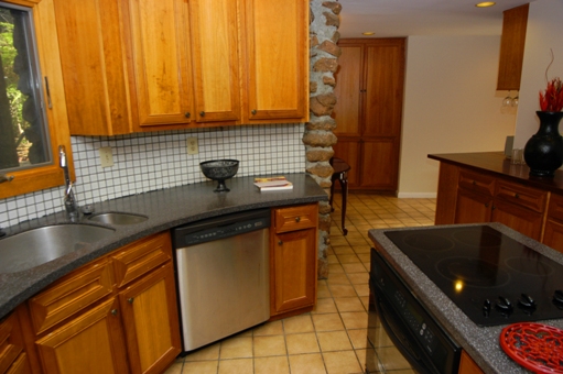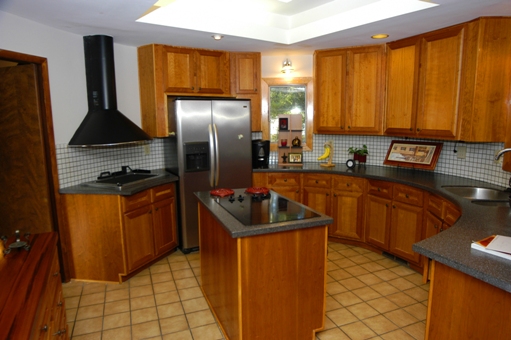 • DESIGNER KITCHEN has a round shape and features solid surface countertops and a ceramic tile backsplash, maple finish hardwood cabinets. Island with solid surface cook top and stainless steel oven. Huge stainless steel sink with gooseneck faucet. Serving buffet and cabinets along one side of kitchen. Skylight plus recessed lighting creates ample light. Ceramic tile floor. Open to breakfast room.