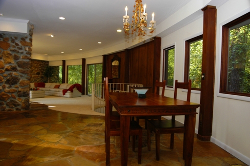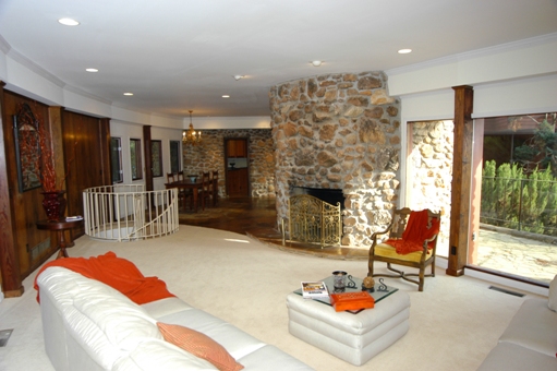 • FORMAL LIVING ROOM features white carpet, two walls of floor to ceiling windows, exposed stone wall, fireplace with floor to ceiling exposed stone and gas logs. Open to dining room. Spiral staircase leads to rec room on terrace level. Recessed lighting. Stained wood trim and moldings.