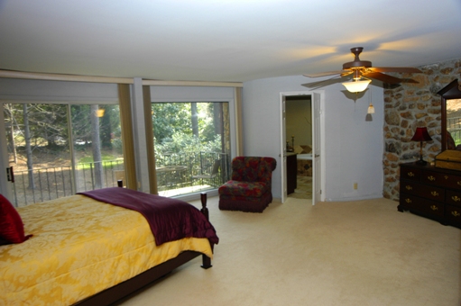 • MASTER BEDROOM SUITE is spacious and plush. Two sets of glass doors open to private balcony. White carpet. Exposed stone wall. Wall of closets with stained wood trim. Recessed lighting. Grass cloth on walls.