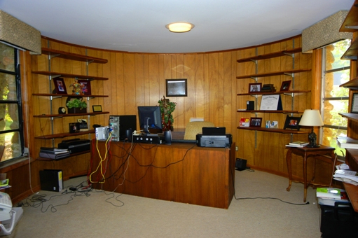 • OFFICE IN THE ROUND has two windows, carpet, wood paneling,