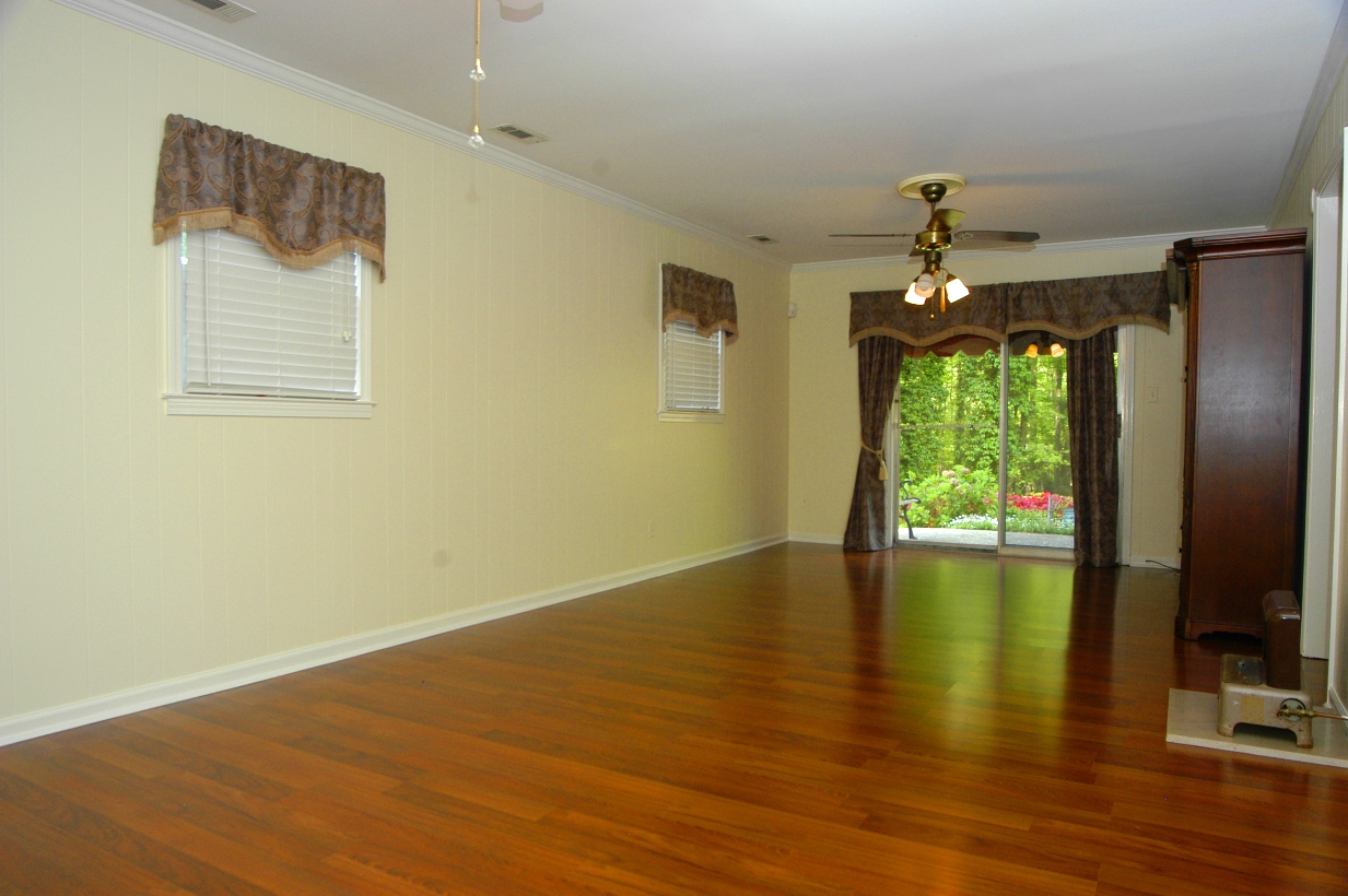 SPACIOUS REC ROOM features pre-finished hardwood floors, lots of windows, glass doors to private patio, 2 ceiling fans and a closet.