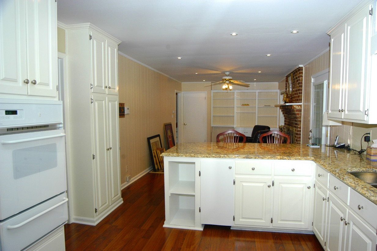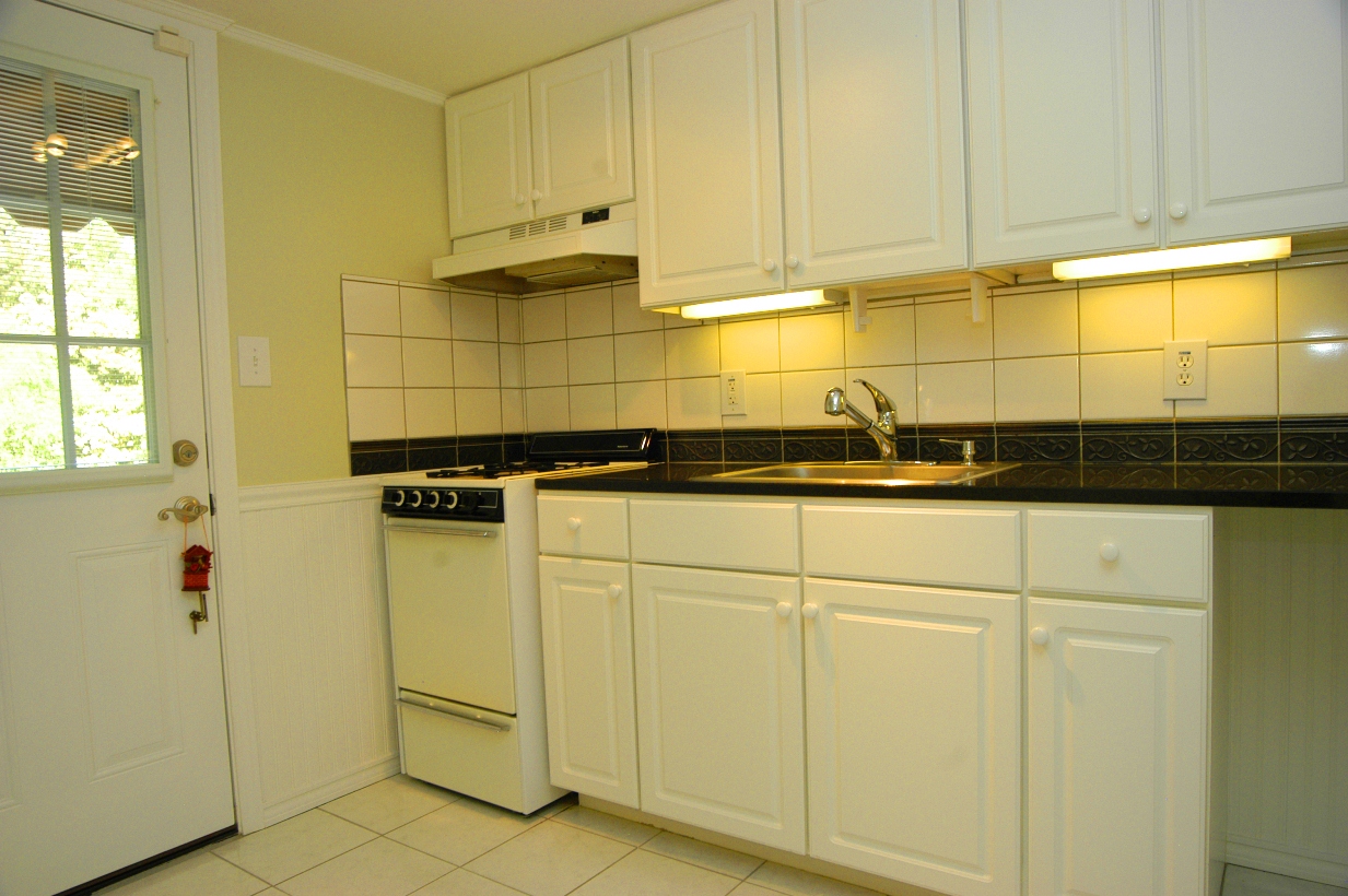 IN-LAW SUITE KITCHEN has lots of white cabinets, black granite countertop, Kenmore gas range. Door to back yard.