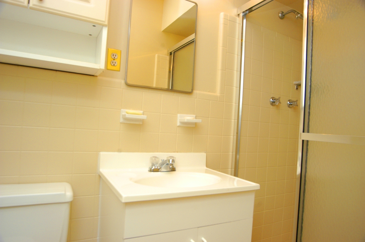 IN-LAW SUITE has a BEDROOM with pre-finished hardwood floors, BATHROOM with ceramic tile floor, white vanity cabinet/sink and walk in shower. Shower has sauna and steam!