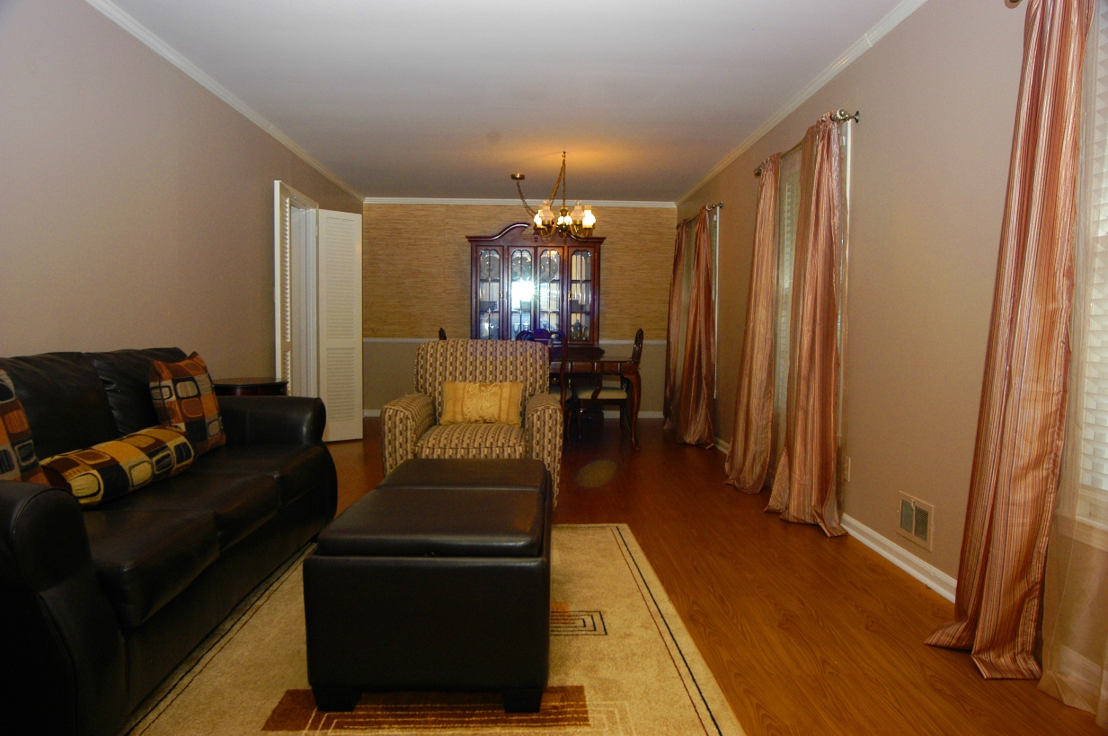 LIVING ROOM off front foyer features hardwood floors, crown molding, 2 inch wood blinds on two windows.
