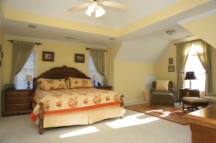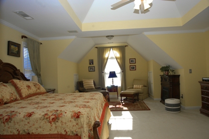 Elegant MASTER SUITE on second floor is a retreat from hectic daily life. Walls were expanded by several feet in length and width to create a spacious environment. Sitting area easily accommodates comfortable chairs or sofa group. Dramatic tray ceiling with ceiling fan and light. Eave storage closets-one is cedar lined. Security system control pad and programmable thermostat control. Neutral carpet. Ritz Carlton comfort in your own home.
