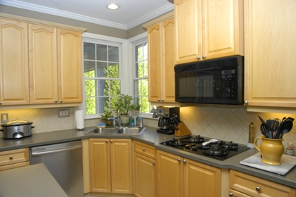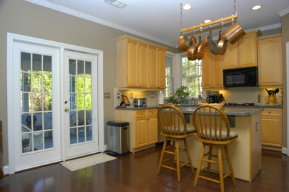 DESIGNER KITCHEN suitable for a Food Network chef. Maple cabinets (CANAC) with Corian countertops and task lighting. Breakfast bar island. Desk area. Walk-in pantry. Stainless-steel corner sink with window above. Hardwood floors. Lots of recessed lighting. Open to the family room so you never miss a beat in the conversation. BREAKFAST AREA has double French doors that open to screen porch. PREMIUM APPLIANCES: Jenn Air gas cooktop with Microwave-ventahood combination above (black glass finish). Jenn Air double oven (black glass finish). Newer Whirlpool stainless steel finish dishwasher.