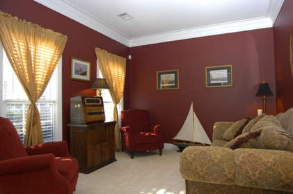 FORMAL LIVING ROOM with a rich designer red motif has a heavy crown molding, neutral carpet and two windows.