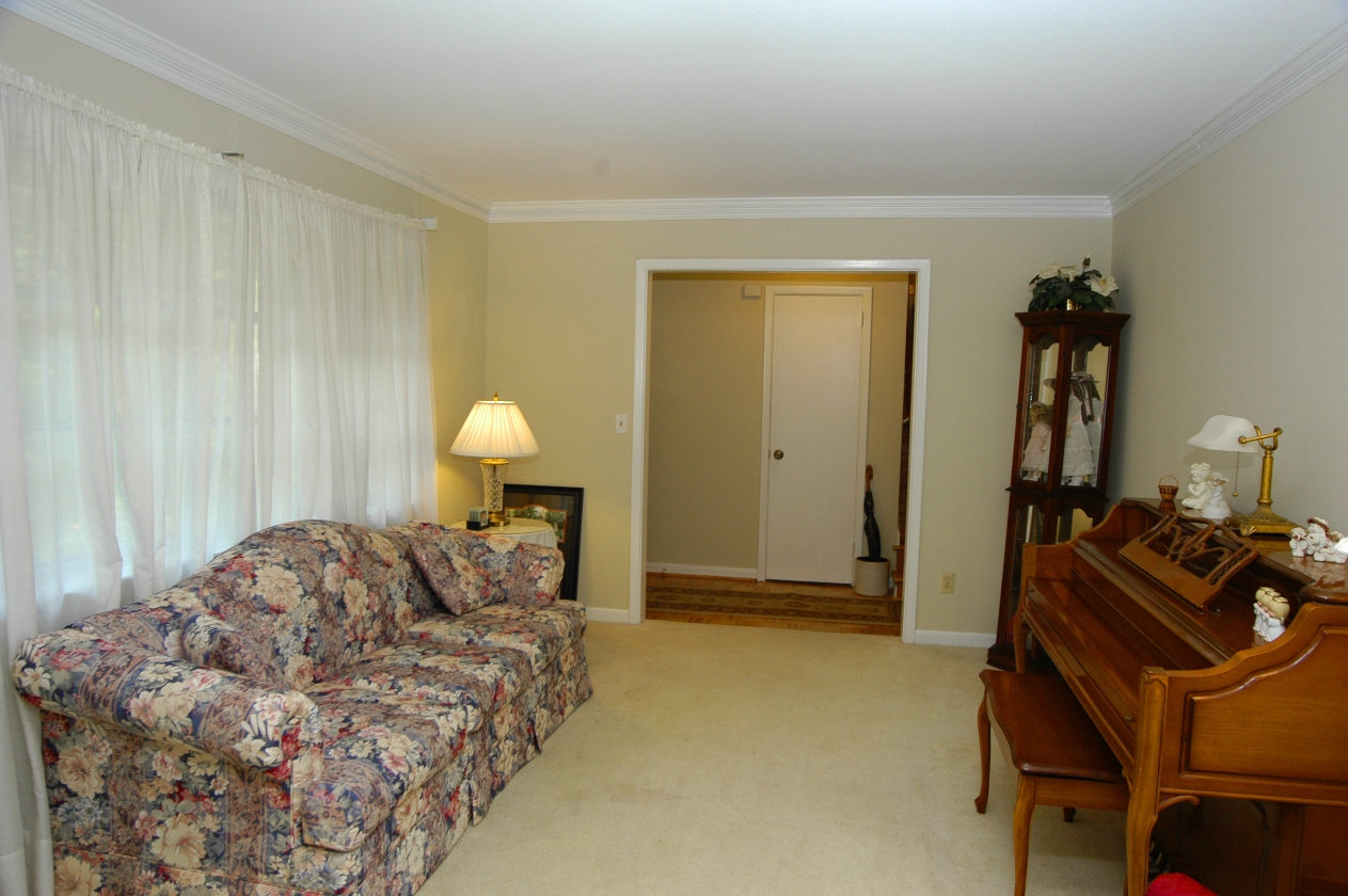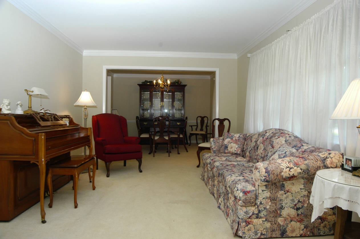 - FORMAL LIVING ROOM features neutral carpet over original hardwood floors. Triple window. Open to dining room.