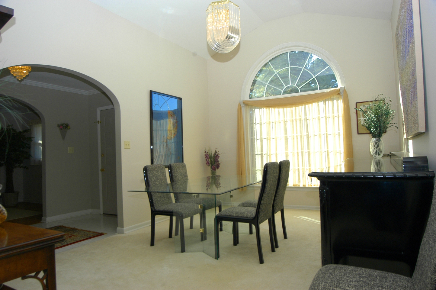 - ENTRANCE FOYER features a white marble tile floor, arched openings to formal living and dining rooms. Cased opening to family room. Crystal flush-mount chandelier.