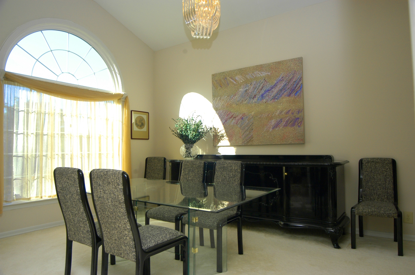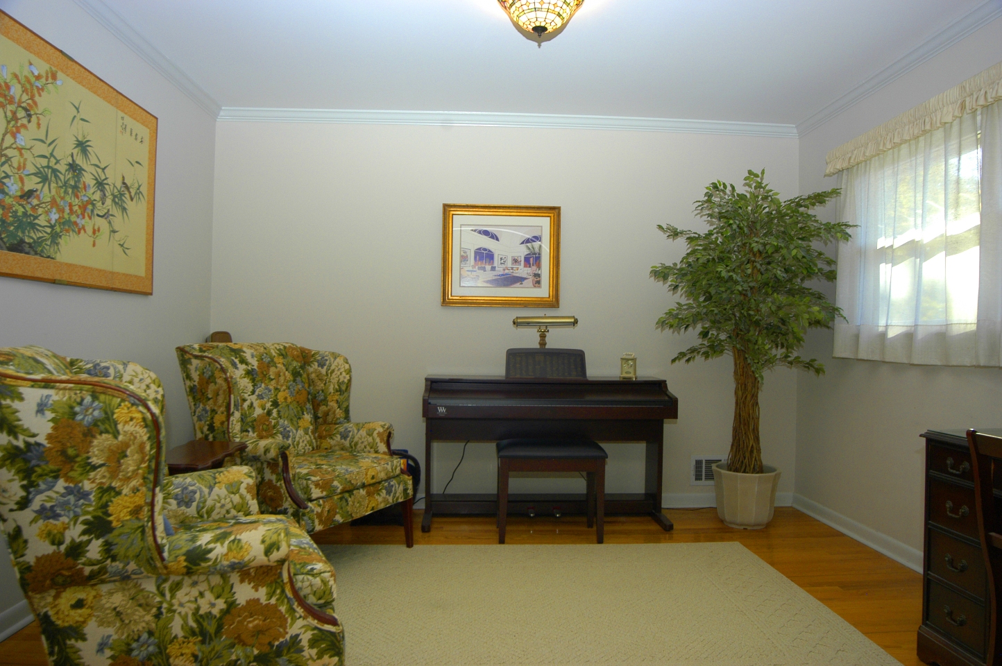 - Soaring barrel vaulted ceiling in DINING ROOM accommodates a large Palladian window. Neutral carpet. Double French doors open to great room. LIVING ROOM features original hardwood floors, double window and Tiffany style light fixture.