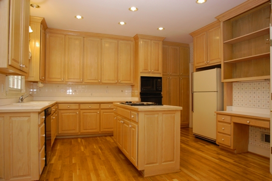 ¨ SPACIOUS KITCHEN features custom raised panel cabinets with light stain finish, white laminate countertop with ceramic tile backsplash. Newly refinished hardwood floors. Island has a downdraft range and ceramic tile top. Double bowl white porcelain sink with window above. Garbage disposal. Built in pantry. Built in desk with bookshelf above. PREMIUM APPLIANCES: Jenn Air downdraft electric cooktop in black glass finish. GE self cleaning oven plus microwave oven, black glass. Whirlpool black glass dishwasher.