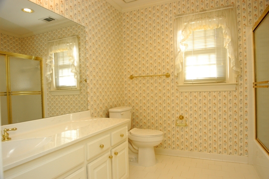 ¨ HALL BATH works like a Jack and Jill bath because of a back hall separating BR area from landing. Vanity cabinet and sink, ceramic tile floor, tub-shower combination with ceramic tile walls, linen closet.
