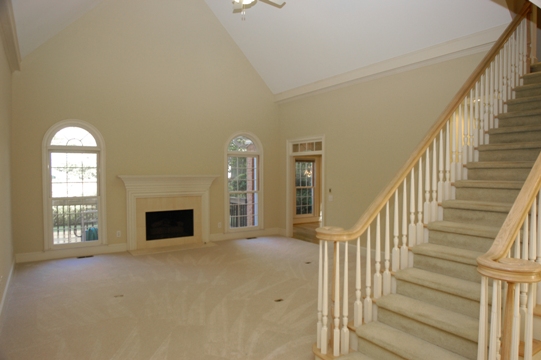 ¨ VAULTED GREAT ROOM features a fireplace with gas log lighter. Custom mantle. Two floor to ceiling windows with radius transom windows flanking fireplace. New carpet(2011). Wet bar with glass shelves above. Premium wood moldings. New carpet. Open staircase to second floor separates great room and dining room.