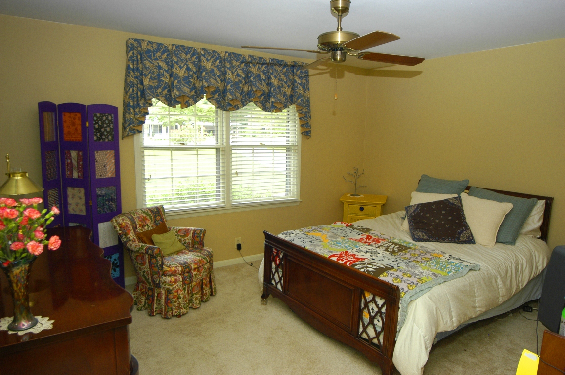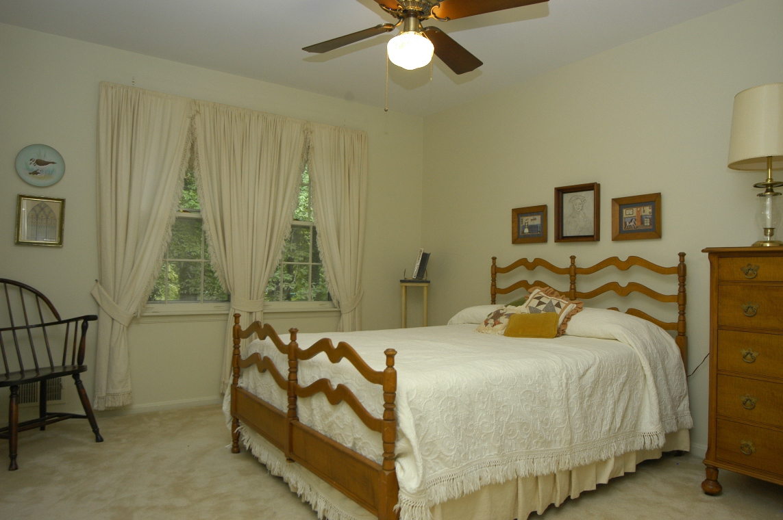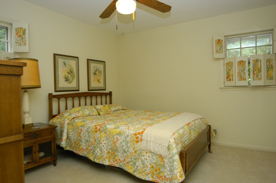 BEDROOM #2 has hardwood floors under neutral carpet, good closet, ceiling fan. Entrance at mid hall.
