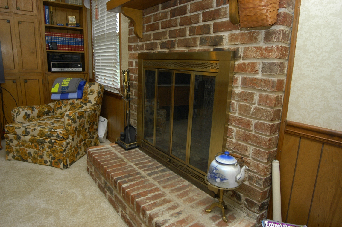 FAMILY ROOM has neutral carpet. Masonry fireplace with floor to ceiling exposed brick, custom mantle and glass doors. Windows flanking fireplace have 2 inch wood blinds. Built in bookcase. Paneling under chair rail molding. Cased opening to foyer.