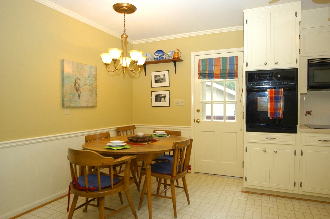 BREAKFAST ROOM open to kitchen has a door to landing and steps to yard. Door to basement steps. Door to dining room. Vinyl floor. Chandelier.