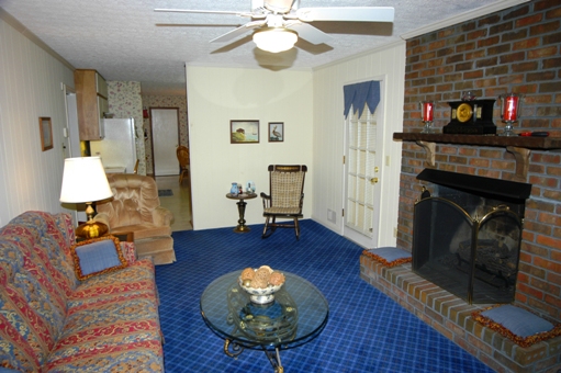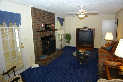 - FAMILY ROOM features a masonry fireplace with floor to ceiling exposed brick. Brick hearth and gas logs. Carpet. Painted wall paneling. Door to In-Law Suite apartment.