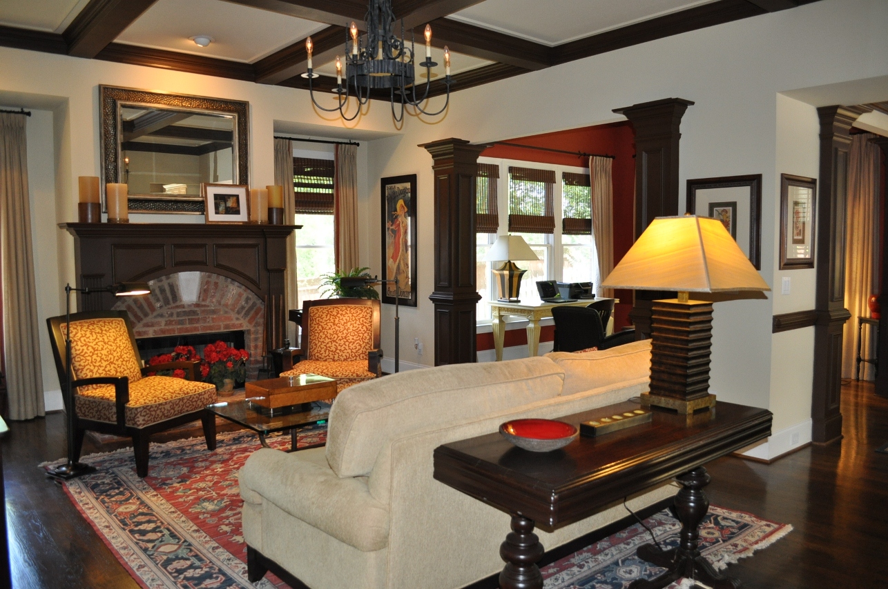 - Inviting FAMILY ROOM has a coffered ceiling, brick fireplace with custom mantle, wrought iron chandelier, detailed wood moldings. POWDER BATH with custom vanity cabinet and sink in front hall.