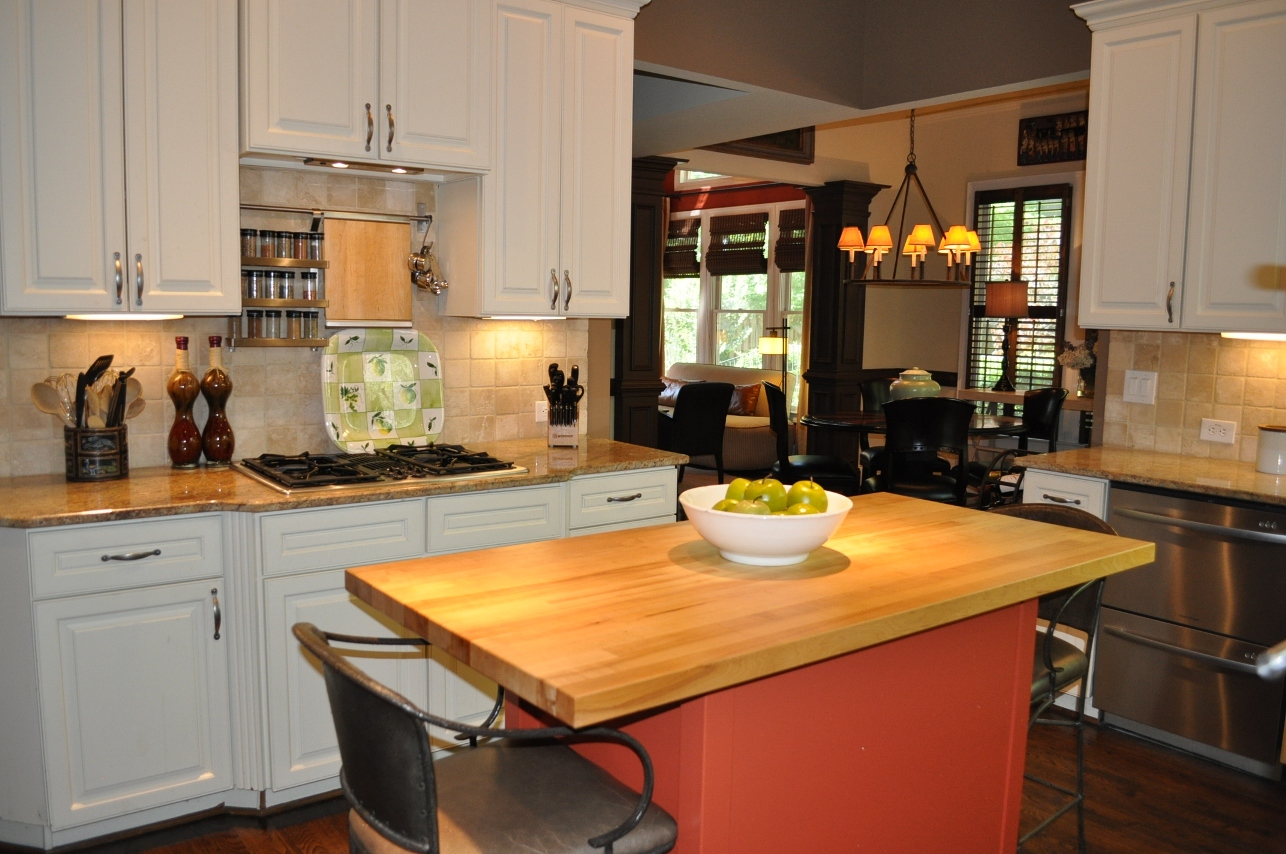 - KITCHEN features granite countertops with tumbled marble tile backsplash. Work island with real butcher block top and stainless steel drawers below. Cabinets have raised panel doors and eggshell enamel finish. Over-counter lighting. Large corner sink with windows overlooking private patio. Open to breakfast room.