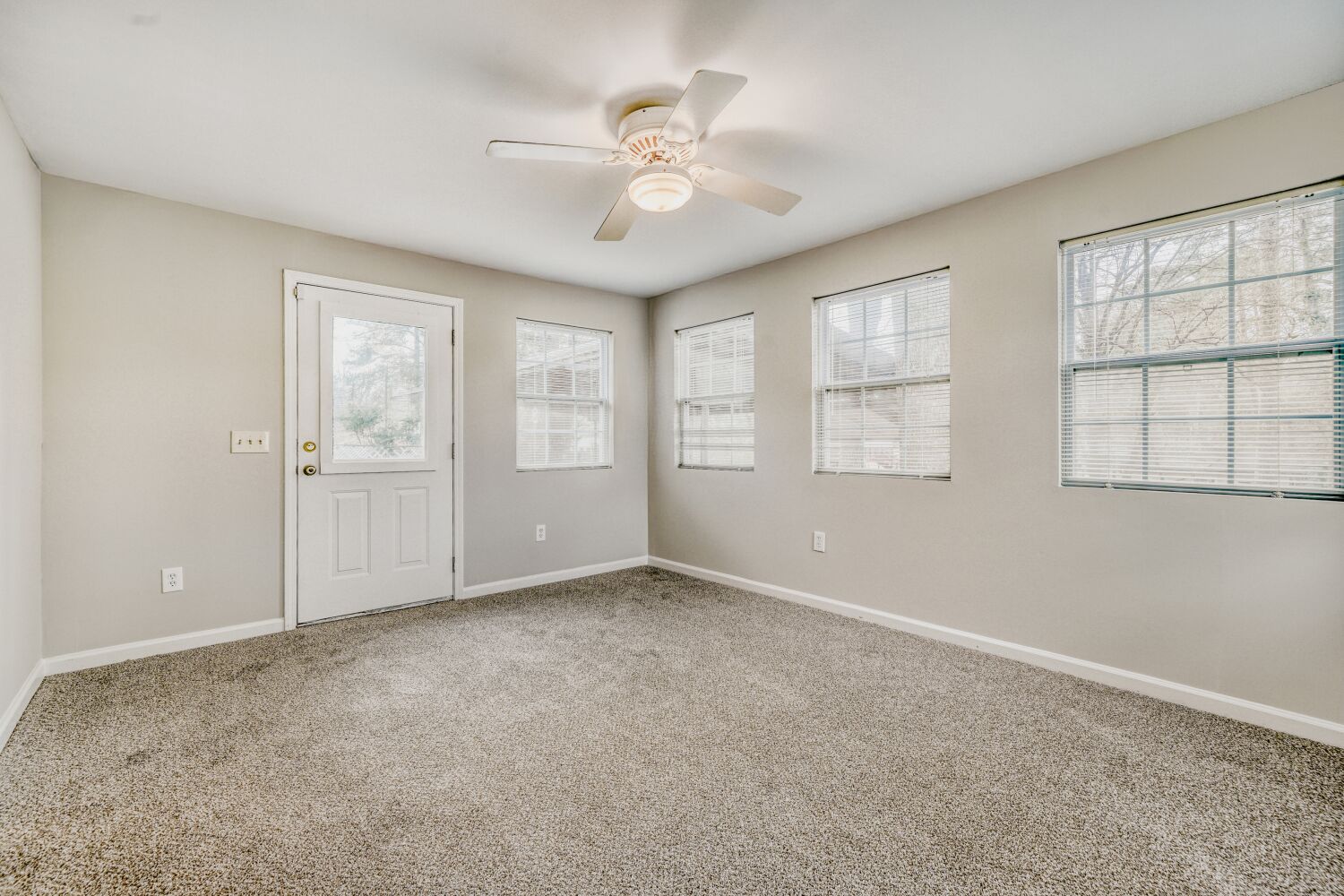 A keeping room next to the kitchen was originally the family room. Now it offers flex space for your family: room for another dining table, desks, a sitting area, or a TV area. You will know the greatest need for your family, and the space is ready to make that happen. Two glass doors lead from this area to a more common living space. One door leads to a family room with a brick fireplace (gas logs) and generous space for watching the big game on TV. Or just chill with family and friends. There is carpet floor covering in this room to keep it cozy, and some bookshelves for your collections. A second door leads to a Sun Room with three walls of windows. This attractive space can be enjoyed in all 4 seasons. Three walls of windows bring in the sunshine and a ceiling fan overhead keeps it cool. There is carpet in this room also.