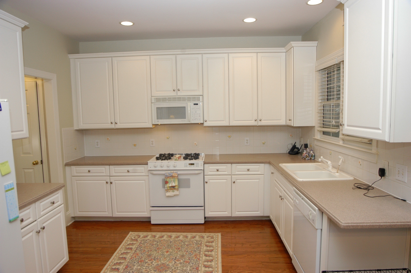 UPDATED KITCHEN features solid surface countertops, white cabinets, porcelain double bowl sink, white ceramic tile backsplash. Hardwood floors, recessed lighting. Open to breakfast room, great room.