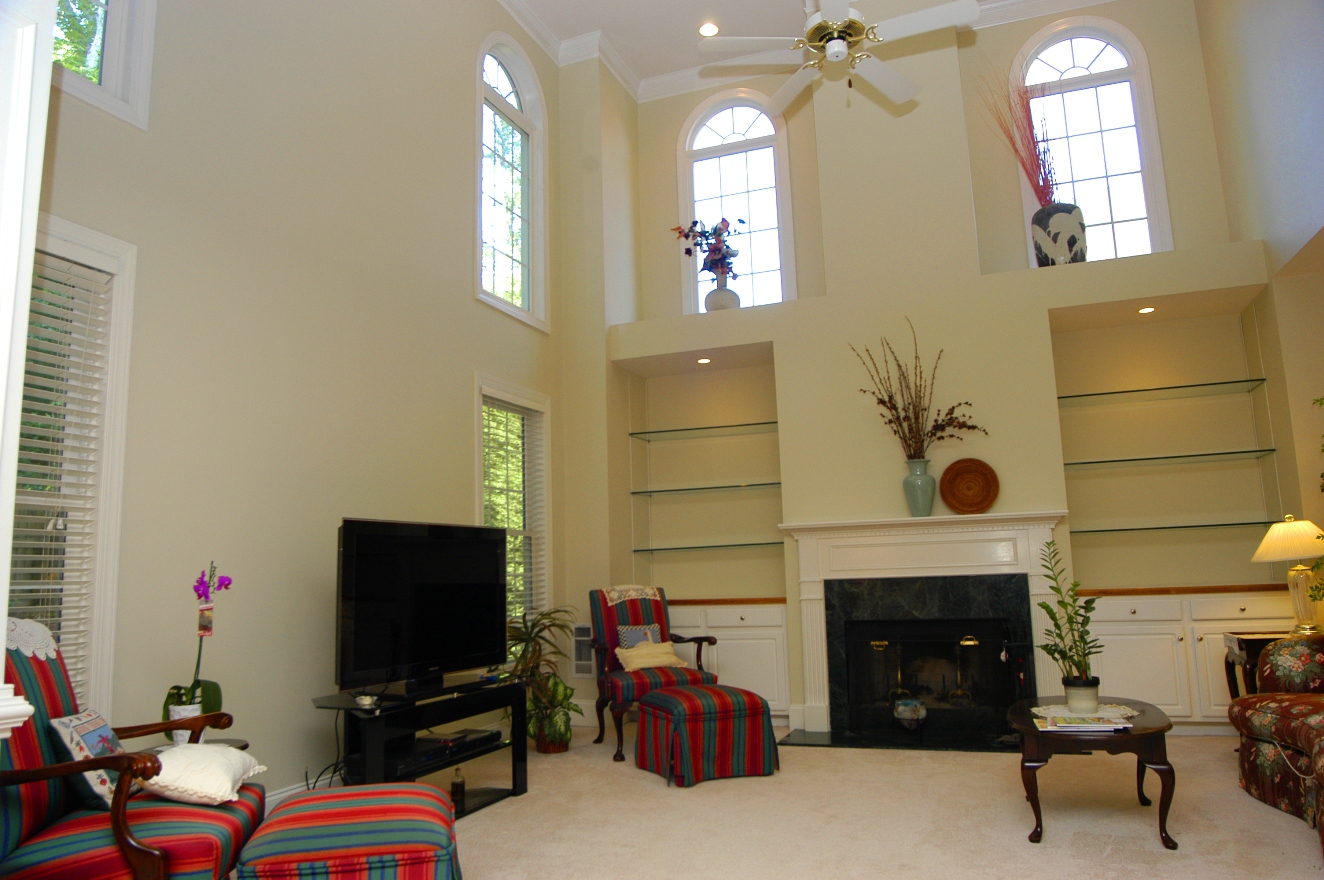TWO STORY GREAT ROOM has fantastic light from 4 radius windows. Fireplace with marble surround and gas log lighter. Bookcases flanking fireplace have cabinets and glass display shelves. Neutral carpet. Ceiling fan. 2nd floor balcony overlooks great room.